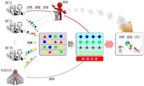在以數(shù)據(jù)驅(qū)動業(yè)務(wù)的模式中,數(shù)據(jù)中心將集中匯聚來自于各個業(yè)務(wù)部門及社會公眾的海量數(shù)據(jù)。以指標體系為框架,將跨部門、跨領(lǐng)域的各類數(shù)據(jù)按照一定的秩序和內(nèi)部聯(lián)系進行組織,形成統(tǒng)一的數(shù)據(jù)資源體系。以數(shù)據(jù)資源體系為基礎(chǔ),通過構(gòu)建各類監(jiān)測評價和分析應(yīng)用服務(wù),實質(zhì)性響應(yīng)日常管理和領(lǐng)導(dǎo)決策中的個性化需求,同時支持決策結(jié)果通過指標體系直接反饋到各部門、各系統(tǒng),從而形成“決策”→“工作布置”→“工作落實”→“監(jiān)測評價”→“再決策”這個不斷循環(huán)的業(yè)務(wù)閉環(huán)。