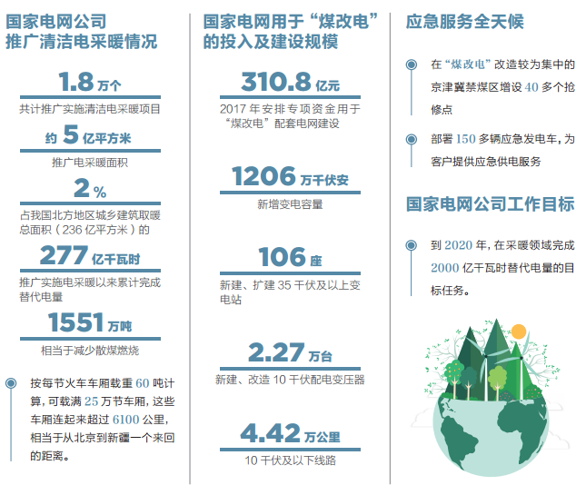 為此,國家電網公司成立了各級專項工作組,具體組織實施“煤改電”工作。為了保障“煤改電”負荷用電要求,各級供電企根據(jù)地方政府確定的改造范圍和規(guī)模,評估電網供電能力,調整電網建設年度計劃。2017 年,國家電網公司安排 310.8 億元專項資金,用于“煤改電”配套電網建設,新建、擴建 106 座 35 千伏及以上變電站,新增變電容量 1206 萬千伏安;新建、改造 10 千伏配電變壓器 2.27 萬臺,10 千伏及以下線路 4.42 萬公里。為確保配套電網建設進度與政府“煤改電”工作有效銜接,保障按時供電,國家電網公司強化內部協(xié)同,建立“日管控、周調度、關鍵節(jié)點重點督導”等工作制度,以村為單位細化工程施工計劃,落實工作責任。截至 9月底,累計完成京津冀及周邊地區(qū)居民“煤改電”用戶 175 萬戶、5763 個村的改造任務,供暖面積超過 1 億平方米。