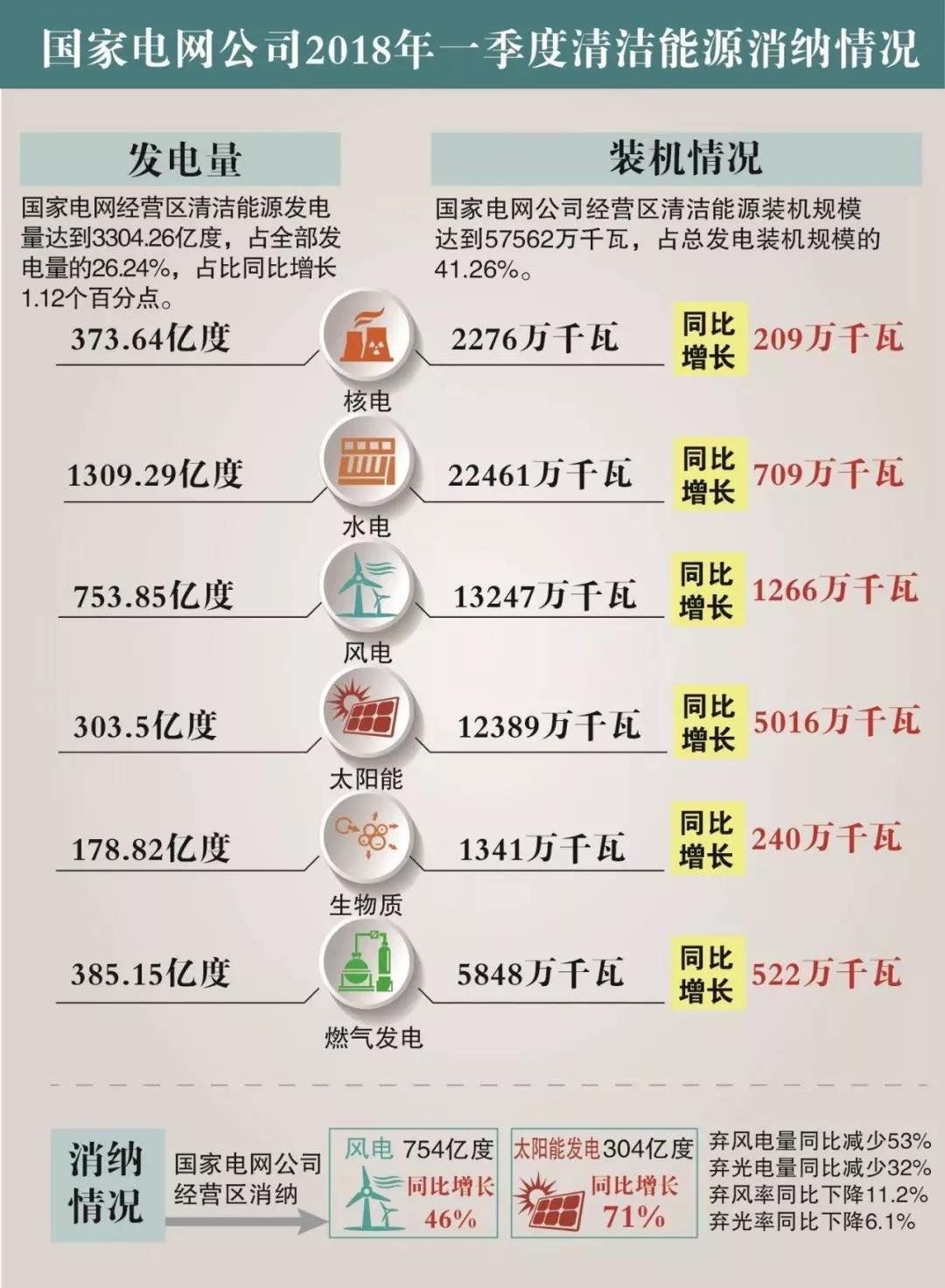 2017年,國(guó)家電網(wǎng)公司經(jīng)營(yíng)區(qū)新能源消納實(shí)現(xiàn)了19個(gè)省區(qū)基本不棄風(fēng),22個(gè)省區(qū)基本不棄光,國(guó)家電網(wǎng)經(jīng)營(yíng)區(qū)新能源棄電量、棄電率實(shí)現(xiàn)“雙降”,全年棄電量同比減少53億度,棄電率同比下降5.3個(gè)百分點(diǎn)。2018年一季度,國(guó)家電網(wǎng)公司經(jīng)營(yíng)區(qū)無(wú)棄水,棄風(fēng)棄光電量為67.3億度,同比減少49.2%;棄風(fēng)棄光率為6%,同比下降10個(gè)百分點(diǎn)。2018年一季度再次實(shí)現(xiàn)了棄電量及棄電率“雙降”。