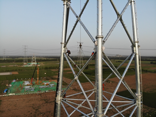 國網(wǎng)河北電力員工奮戰(zhàn)在1000千伏定河雙線遷改工程建設(shè)現(xiàn)場,該工程投運后將為雄安新區(qū)建設(shè)提供可靠電力支撐。谷玉龍 攝